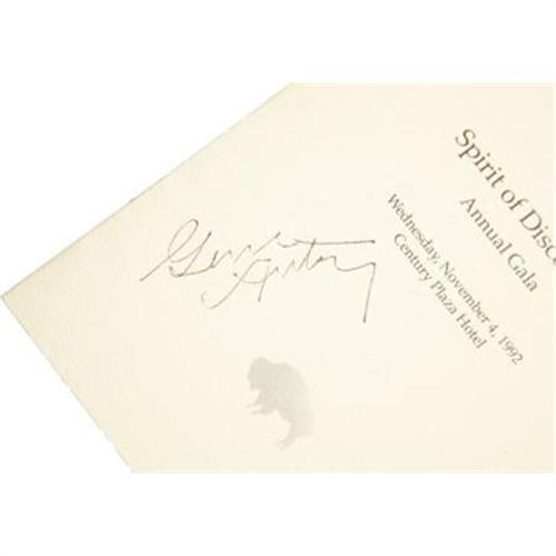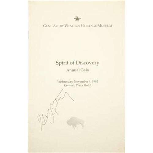 <B>Gene Autry: Signed Program for the Gene Autry Western Heritage Museum <I>Spirit of Discovery Annual Gala. </B></I></B></I><B>Wednesday, November 4, 1992. Century Plaza Hotel.</B></I> Ten leaves on buff card stock. (8.5” x 5.5”). Includes menu and program for the event. Attractively signed by Gene Autry on the front. Fine condition.<BR><BR><b>Shipping:</b> Books & Catalogs (<a target="_blank" href="http://www.heritageauctions.com/common/shipping.php">view shipping information</a>)