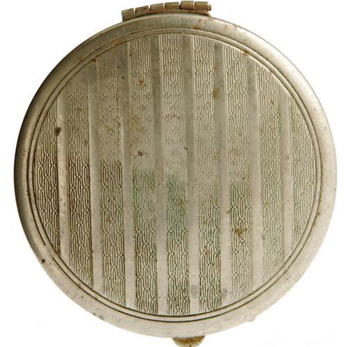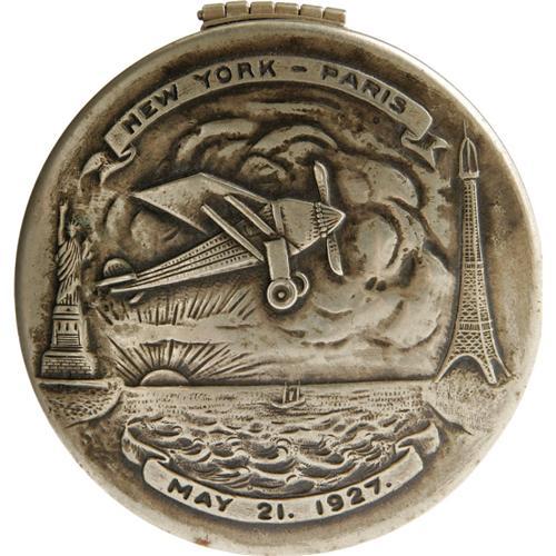 <B>Spirit of St. Louis Compact.</B></I> A lady's German silver compact, 2" diameter, having the Spirit of St.Louis flying across its hinged lid in a high relief stamping. Supplementing the famous aircraft are renderings of the Eiffel Tower, the Statue of Liberty and two banners, "NEW YORK - PARIS" and "MAY 21, 1927". Nicely toned old metal. Inside is a mirror and a well containing make-up residue. Very fine condition. <BR><BR><B>Important notice