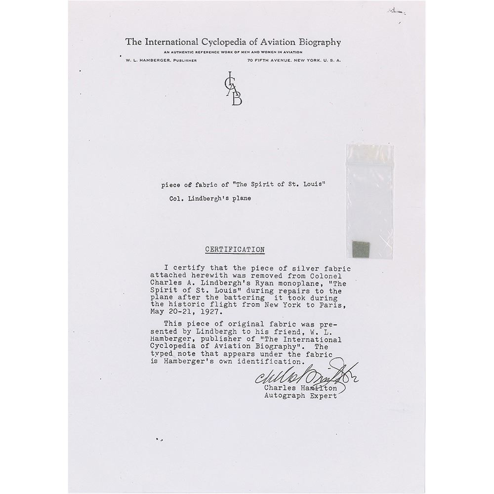 Tiny 3/8˝ x 3/8˝ swatch of flown fabric from Charles Lindbergh's Spirit of St. Louis aircraft cut from a larger piece, encapsulated in a small bag and affixed to a photocopied certificate of authenticity from noted dealer Charles Hamilton, describing the larger swatch that was presented by Lindbergh to his friend, W. L. Hamberger, publisher of 'The International Cyclopedia of Aviation Biography.' In fine condition.