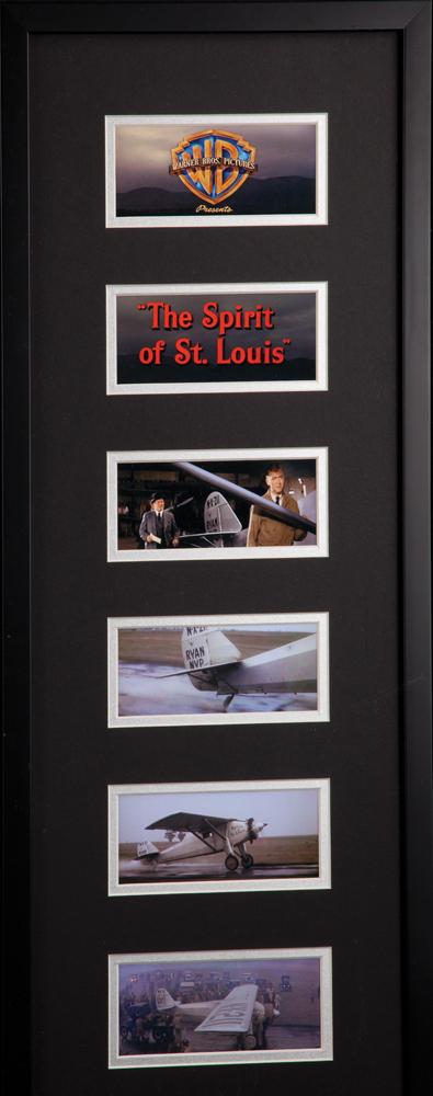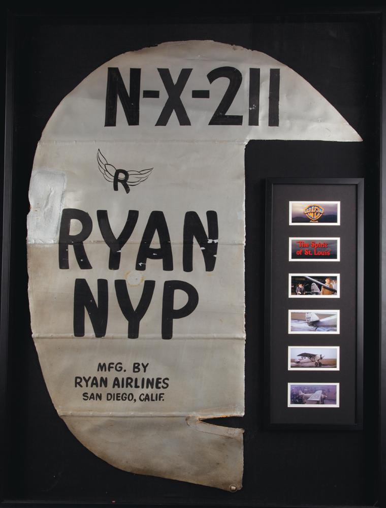 (Warner Bros. 1957) This is the fabric from the tail section of the Mantz replica used in the 1957 film, Spirit of St. Louis, starring Jimmy Stewart. The plane was flown by Jimmy Stewart but mainly flown by Paul Mantz. It was used for all of the takeoff scenes and all Europe scenes. There were only three Ryan B-1 Broughams located to replicate the “Spirit” in the film. After the film, the fabric skin of the plane was replaced. One side of the tail was retained by one of the men involved in the re-covering. This is the other side of the tail and it is the only piece available today. Measures 27 in. x 59 in. and housed in a custom framed display measuring 46 in. x 62 in. x 3 in. with scenes from the film. Included with the lot are copies of articles and clippings about the Spirit of St. Louis plus a copy of Ryan Broughams and Their Builders by William Wagner which goes into detail about the surviving planes and other historical details.
