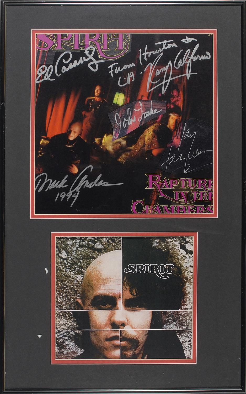 Rapture in the Chambers album signed on the front cover in silver ink by Mark Andes, Ed Cassidy, and Randy California, and signed in silver ink on clipped parts of an identical album affixed to the identical portions of the signed album by John Locke and Jay Ferguson. Double matted and framed with an unsigned album cover, to an overall size of 15.5 x 24.5. In fine condition, with aforementioned clipped signatures affixed to cover. Oversized.