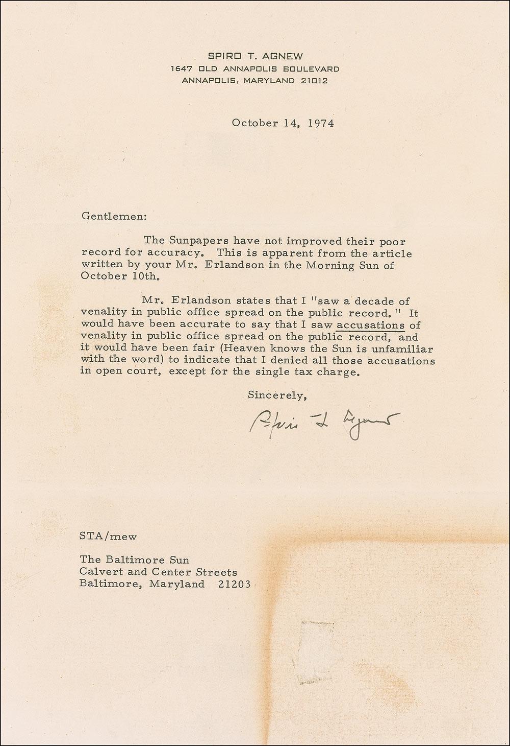 TLS, one page, 7.25 x 10.5, personal letterhead, October 14, 1974. Agnew writes a stern letter to the editors of the Baltimore Sun newspaper. In full: “The Sunpapers have not improved their poor record for accuracy. This is apparent from the article written by your Mr. Erlandson in the Morning Sun of October 10. Mr. Erlandson states that I ‘saw a decade of venality in public office spread on the public record.’ It would have been accurate to say I saw accusations of venality in public office spread on the public record.’ It would have been fair to say that I saw accusations of venality in public office spread on the public record, and it would have been fair (Heaven knows the Sun is unfamiliar with the word) to indicate that I denied all those accusations in open court, except for the single tax charge.” In very good condition, with light creasing and wrinkling, some light staining and an irregular block of toning at the lower right corner, and two areas of thin paper from old tape removed on the reverse. Accompanied by the original mailing envelope, aa clipping of the newspaper article to which Agnew refers, and his Letter to the Editor as it appeared in print.