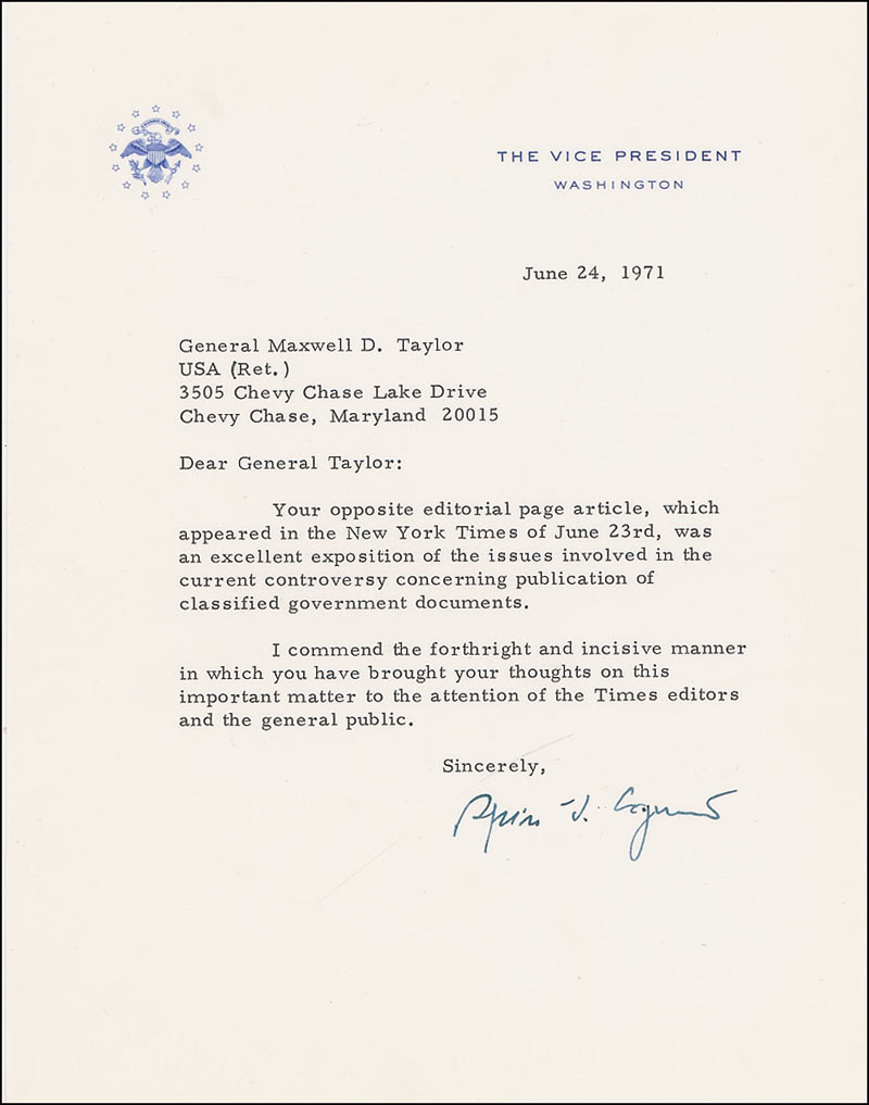 TLS signed “Spiro T. Agnew,” one page, 7 x 9, The Vice President letterhead, June 24, 1971. Vice President Agnew writes retired General Maxwell D. Taylor. In full: “Your opposite editorial page article, which appeared in the New York Times of June 23rd, was an excellent exposition of the issues involved in the current controversy concerning publication of classified government documents. I commend the forthright and incisive manner in which you have brought your thoughts on this important matter to the attention of the Times editors and the general public.” In fine condition, with central horizontal fold.