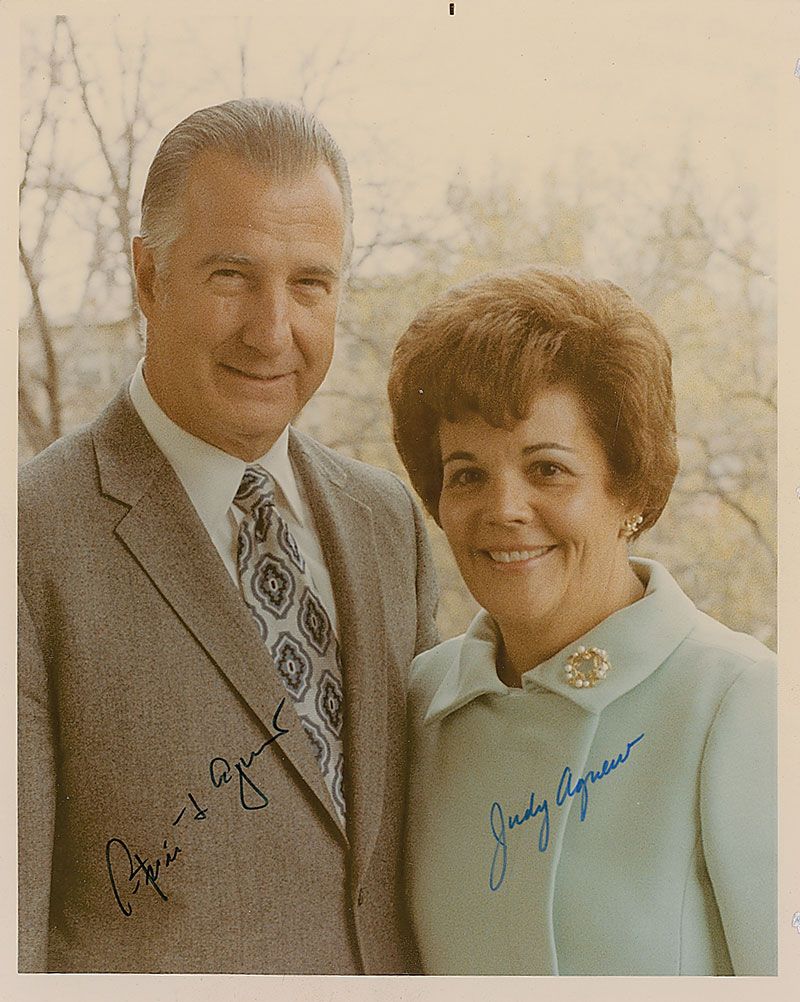 Color satin-finish 8 x 10 photo of the vice president and his wife, signed in black felt tip, “Spiro T. Agnew,” and in blue felt tip, “Judy Agnew.” In fine condition, with binder dings to right edge.