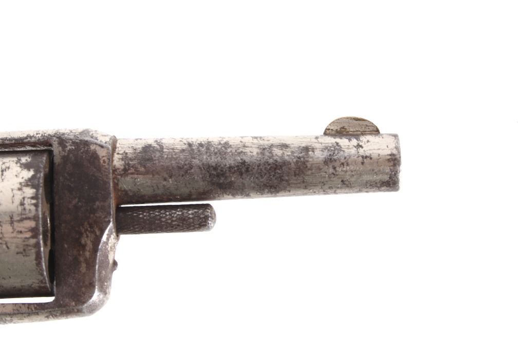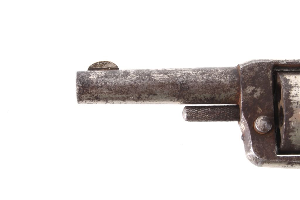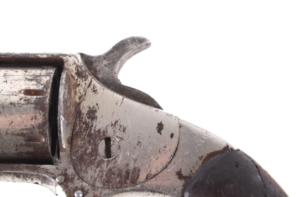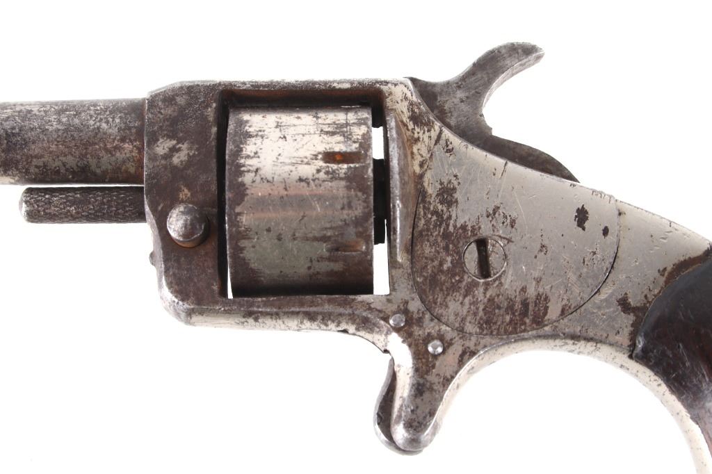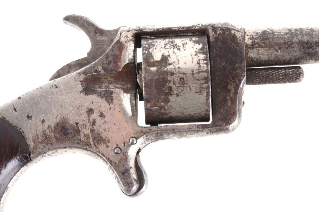 Featured in this lot we have a Spitfire spur trigger pocket revolver chambered in .22 caliber. This revolver originates from the late 1800's. This spur trigger revolver has a seven shot cylinder chambered in .22 RF. The pistol displays a 2 1/4" long round barrel, walnut birdhead grips, and nickel finish. The revolver is faintly marked across the top of the barrel reading "SPITFIRE". The revolvers single action shows functionality with some light play in the cylinder. The revolver shows fair condition with some rusting and wear across the exterior. The pistol weighs 6oz. Serial Number: 3539. This firearm qualifies as an Antique, and does not require FFL Transfer or NICS Background Check.