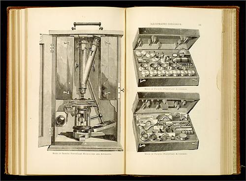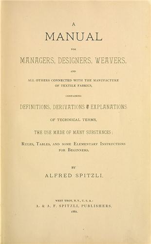 Spitzli's Manual and Catalogue of Optical Instruments, 1881 "A manual for managers, designers, weavers and others connected with the manufacture of textile fabrics, containing definitions, derivations and explanations of technical terms by Alfred Spitzli, West Troy, N.Y., 1881." This is an early "illustrated catalogue of optical instruments, accessory apparatus, stationery and books for designers and others engaged in the manufacture of textile fabrics", all together 118 pages and advertising pages. Inner book loose, everything else in normal condition. - Very interesting illustrations, a rare and important catalogue.