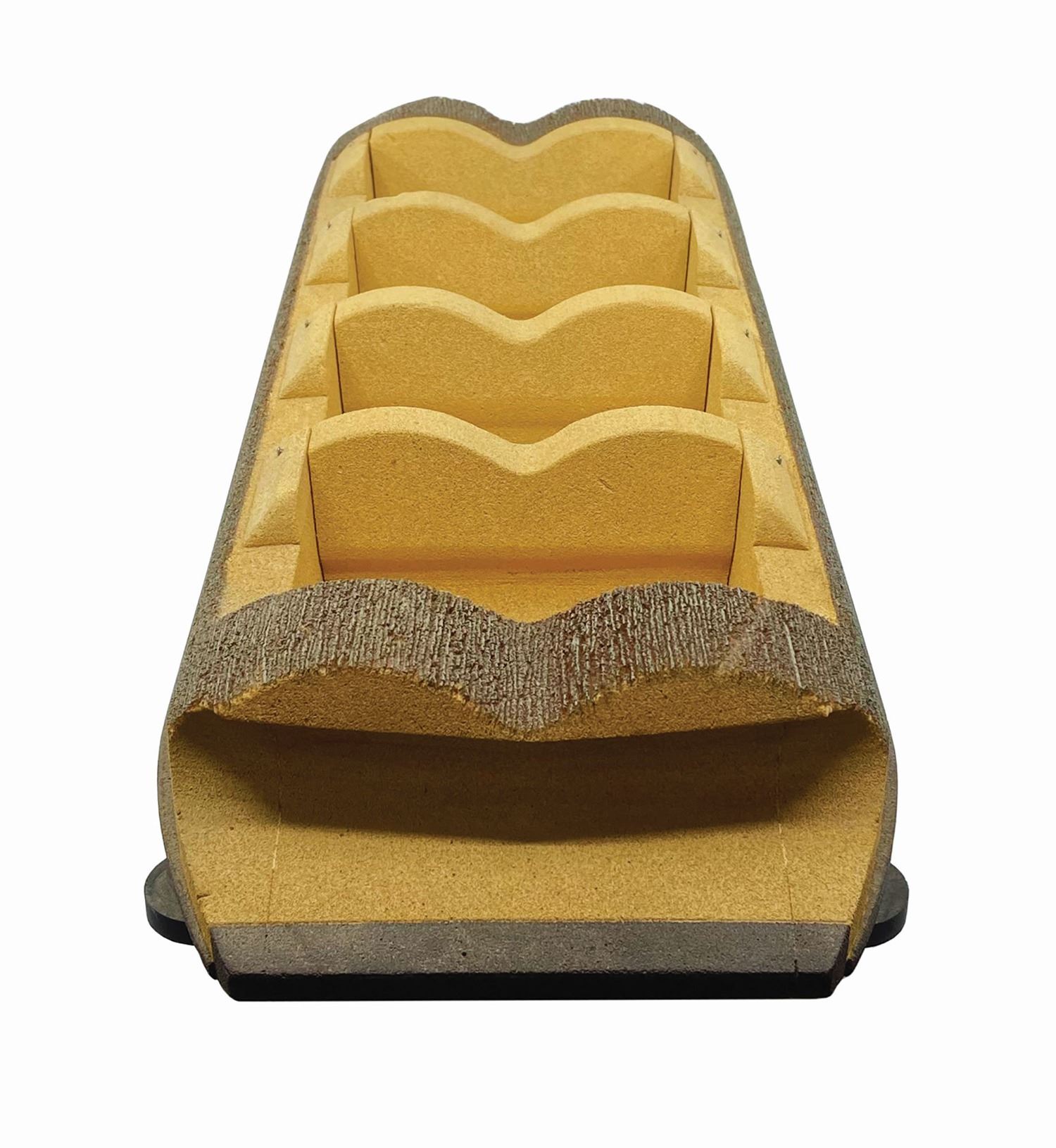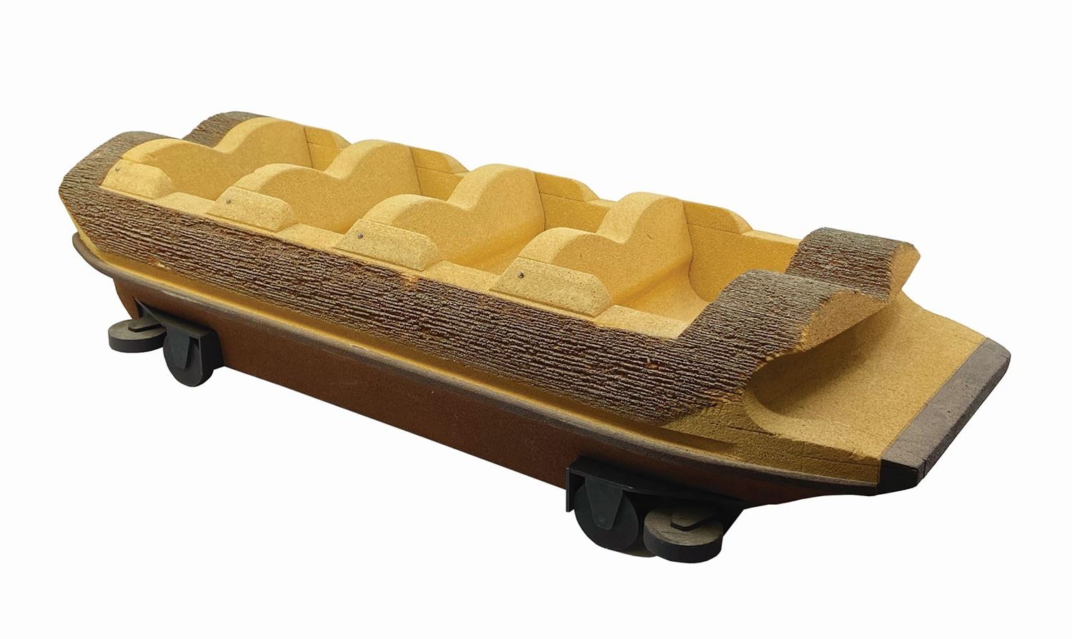 (Walt Disney World, 1992) A hand-crafted Splash Mountain ride vehicle concept model. Created by Walt Disney Imagineering in development of the Magic Kingdom version of the attraction, the model is constructed of hand-carved foam meticulously grooved and painted to create the impression of tree bark. The log model features a cabin with four rows of double seats that are held in place with metal pins, integral bumpers at front and back, and four sets of vertical and horizontal wheels for vehicle movement along as a flume and to grip the track for ascent. A feat of engineering, the model makes visible the special extended bow and recessed bottom of the boat. These features were carefully calibrated so that that vehicle wouldn't take on too much water as it plunges down the final hill into the underground runout, soaking riders to an uncomfortable degree. This model is almost identical to the vehicles pressed into service when the ride first opened at the Magic Kingdom in 1992. Measuring 20.25” long, 4.75” tall and 8” wide, the model is in fine condition with minimal wear.