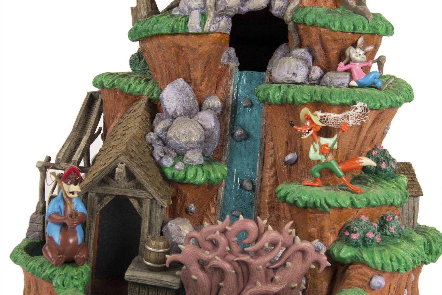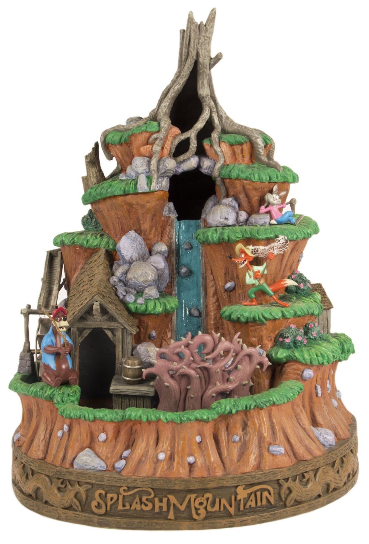 (Disneyland, 2005) A stunning "Magical Big Figurine" created by Larry Nikolai for the 50th anniversary of Disneyland. This Splash Mountain themed "Big Fig" features the characters and imagery seen throughout the attraction and beautifully represents the attraction experience. This "Big Fig" is battery-operated and measures 17" tall. The condition is very good with minor wear from use. There is a small break in Br'er Bear's fishing pole, however a wire runs through it which keeps it attached.