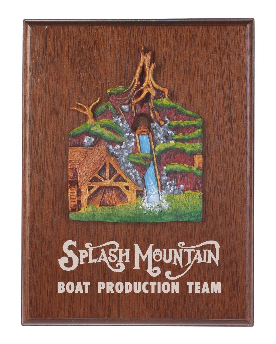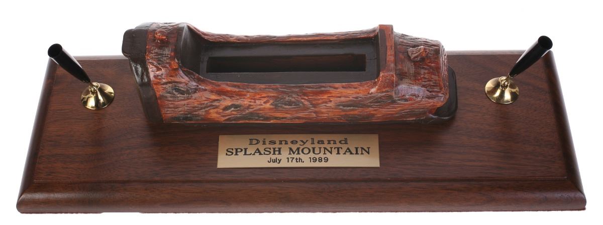 (Disneyland, 1989) Rare pair of crew gifts given to the production team of the "Splash Mountain" attraction upon completion. The plaque measures 8”x10.5” and features a cast-resin relief of the front of the attraction. The 5"x14" pen holder features a 8”x2”x 2” replica of the Splash Mountain ride vehicle with holders for two pens and space for a notepad. In fine condition with minor wear.