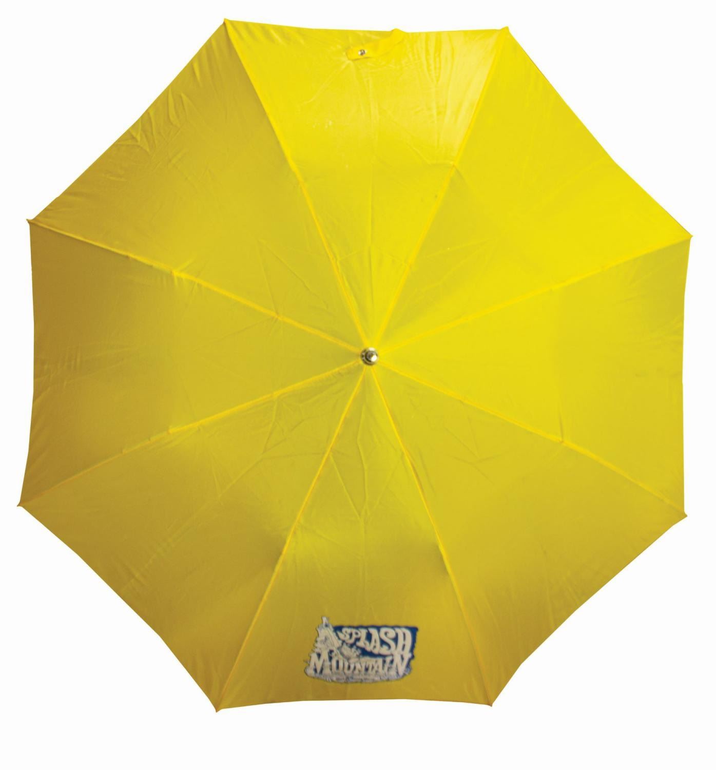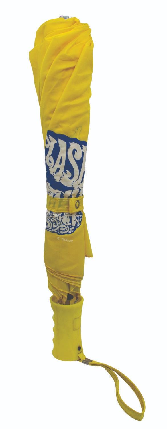 (Disneyland, c.1980s) A Splash Mountain souvenir umbrella from Disneyland. The automatic-open umbrella features a yellow molded plastic grip with a button trigger, and metal telescoping pole, and a yellow nylon canopy with screen printed Splash Mountain illustration. Fully extended, the canopy measures 36" in diameter and the pole with handle is 20" long. The piece is in very good condition with only minor wear.