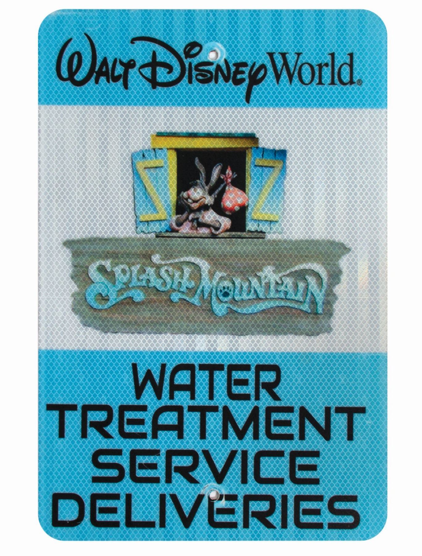 (Walt Disney World, c.2000s) A Splash Mountain water treatment service deliveries sign from Walt Disney World. This parking lot sign features Br'er Rabbit and contains a thin metal core for durability. Measuring 18"x12", the sign is in good condition overall with minor scratching to surface. The two original screw holes are slightly rough to the touch.