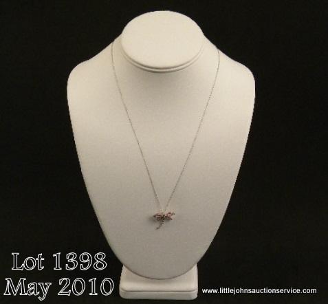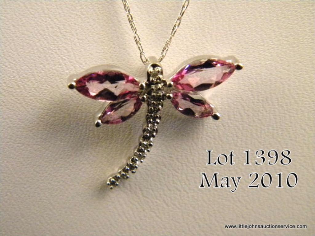 Splendid 10 karat white gold ladies dragonfly design pendant set with four matching pink topaz weighing approx. 1.20 carats and side pave set diamonds. Retail $850.00 Estimate $200-$300