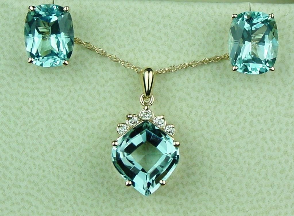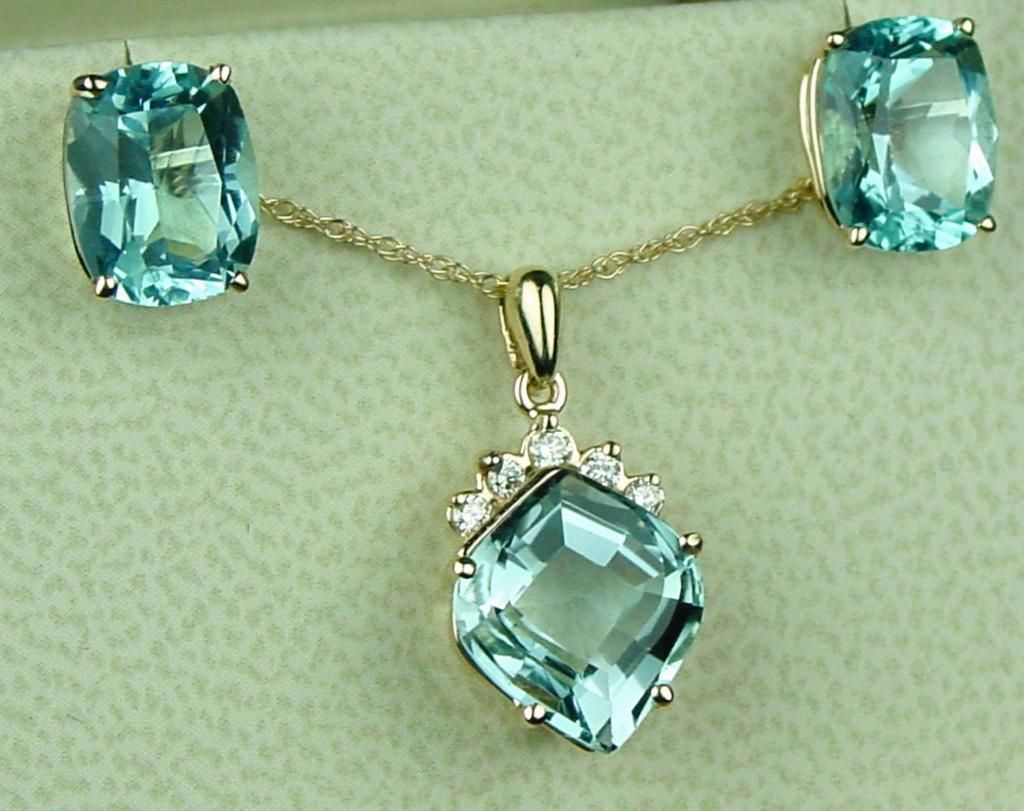 Splendid 14 karat yellow gold ladies pendant/earrings ensemble set with three matching Aquamarines weighing approx. 7.00-9.00 carats and 5 side diamonds of G-H colors and VS clarity. Retail $2,000-$2,500Estimate $1,000-$1,500