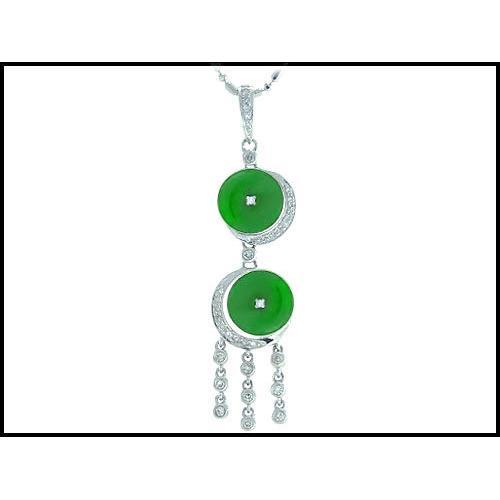 Splendid pendant with 2 jades that measure 9 millimeters (3/8 inches) in diameter and 36 diamonds that weigh approximately 0.26 carats set in 14K white gold. The pendant measures 48 millimeters (1-7/8 inches) long x 12 millimeters (1/2 inches) wide and weighs 3.76 grams total weight.
