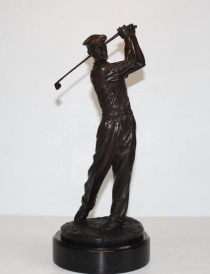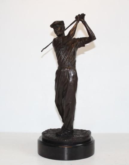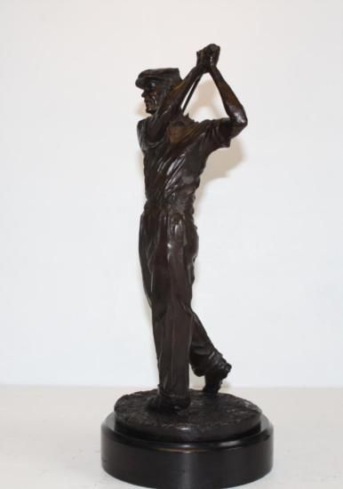 Splendid Ben Hogan Golfer, Bronze Sculpture, After Ron Tunison 14.5"H x 6.5"W x 6.5"D 15 lbs. This bronze sculpture was produced using the Lost Wax casting method. The Lost Wax Cast method is the most precise metal casting technique in existence, ensuring exquisite detail of the original host model which is usually sculpted in clay or wax. This Lost Wax casting method is an extremely labor intensive and expensive process, but the end results produce a Heirloom Quality Masterpiece!