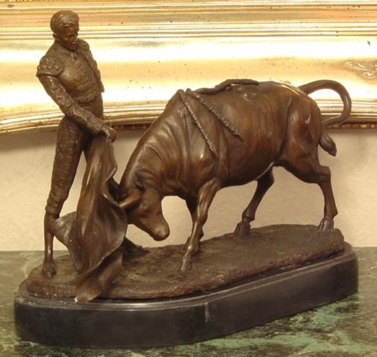 Matador Bronze Sculpture, After Enis, 10"H x 11"W x 6"D 16 lbs. This bronze sculpture was produced using the "Lost Wax" casting method. The"Lost Wax" Cast method is the most precise metal casting technique in existence, ensuring exquisite detail of the original host model which is usually sculpted in clay or wax. This "Lost Wax" casting method is an extremely labor intensive and expensive process, but the end results produce a Heirloom Quality Masterpiece!A matador or torero is the main performer in bullfighting events in Spain, France, and other Spanish-speaking countries. He or she is the person who performs with and kills the bull. The role is also called toreador in English (and in Bizet's opera Carmen), but this term (older than torero) is actually never used in Spain or in Latin America. The term torero encompasses bullfighters who fight the bull in the ring (picadores and rejoneadores). Usually, toreros start fighting young bulls (novillos or, more informally in some Latin American countries, vaquillas), and are called novilleros. They can start fighting mature bulls after a special match, called "the Alternative". At this bullfight the novillero (junior bullfighter) is presented to the crowd as a matador de toros. Bullfighting is traditionally a male sport. A very small number of women have been matadors and cavaleiras (in Portugal), a recent example being Cristina Sánchez. Female matadors have experienced considerable resistance and hostility from aficionados and other (male) matadors.
