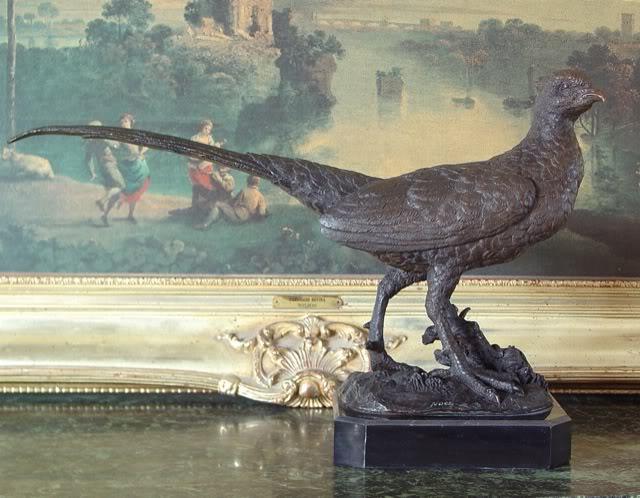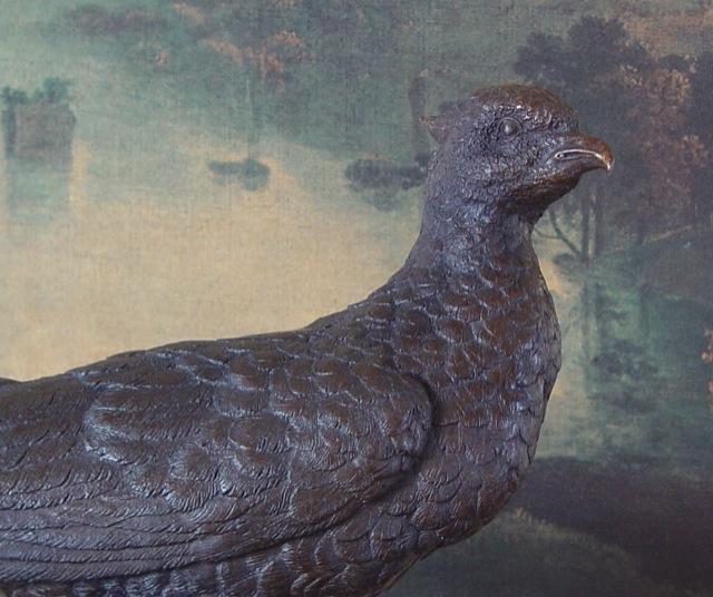 Pheasant Bird, Bronze Sculpture, 13"H x 20"L x 6"D22 lbs This bronze sculpture was produced using the "Lost Wax" casting method. The"Lost Wax" Cast method is the most precise metal casting technique in existence, ensuring exquisite detail of the original host model which is usually sculpted in clay or wax. This "Lost Wax" casting method is an extremely labor intensive and expensive process, but the end results produce a Heirloom Quality Masterpiece!