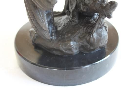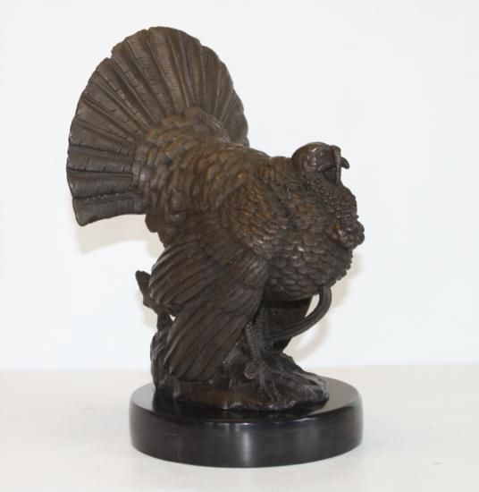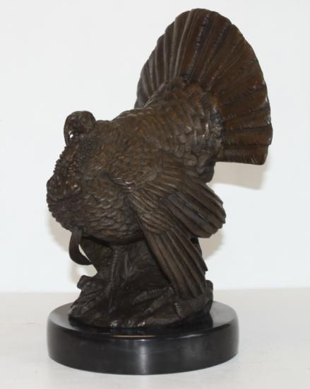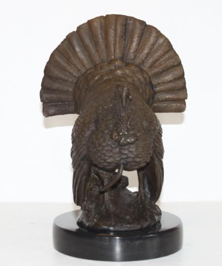 Wild Turkey Bronze Sculpture, After Lobo, 12"H x 7"W x 8"D16 lbs. This bronze sculpture was produced using the "Lost Wax" casting method. The"Lost Wax" Cast method is the most precise metal casting technique in existence, ensuring exquisite detail of the original host model which is usually sculpted in clay or wax. This "Lost Wax" casting method is an extremely labor intensive and expensive process, but the end results produce a Heirloom Quality Masterpiece!