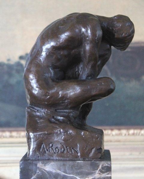 Splendid Male Nude Bronze Sculpture After Rodin 9 1/2inH x 3 inW x 2 3/4in D 8lbs. This bronze sculpture was produced using the "Lost Wax" casting method. The "Lost Wax" Cast method is the most precise metal casting technique in existence, ensuring exquisite detail of the original host model which is usually sculpted in clay or wax. This "Lost Wax" casting method is an extremely labor intensive and expensive process, but the end results produce a Heirloom Quality Masterpiece!