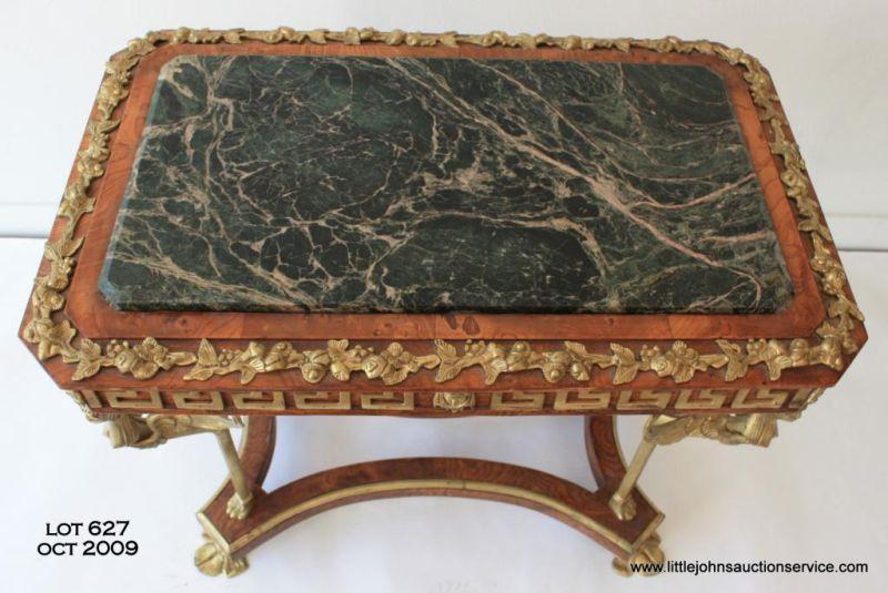 Splendid Napoleonic Empire style end table circa mid 20th century. These represent the finest recreation of the Egyptian campaign featuring gilt bronze supports of bare breasted sphinxes, sumptuous gilded mounts, green marble tops, andfruitwood with inlaid veneers. Suitable for the most luxurious home or office. Acquired by the present owner from Butterfields Los Angeles. Estimate $750 - $1,500.00