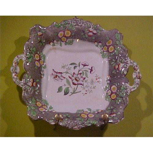 </font></strong>This is a most attractive small 19th century, handled tray by Ridgway. On a white ground there is a center design of flowers. In a wide border around the tray is a very close, small pattern in brown with colorful flowers painted over the brown transfer. The handles are embossed as well as two sides of the scalloped edge. Painted flowers decorate the handles and border. The tray is a most pleasing combination of the brown and the bright colors of the flowers. The size is 11" by 10" including the handles. Condition is excellent.</font>
