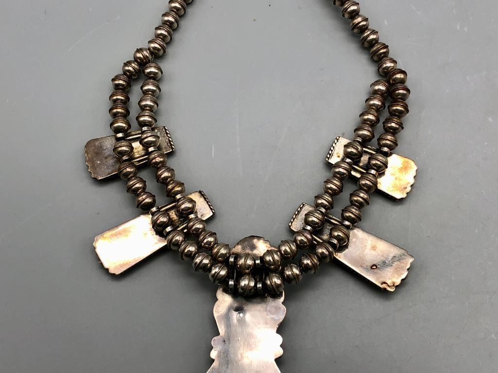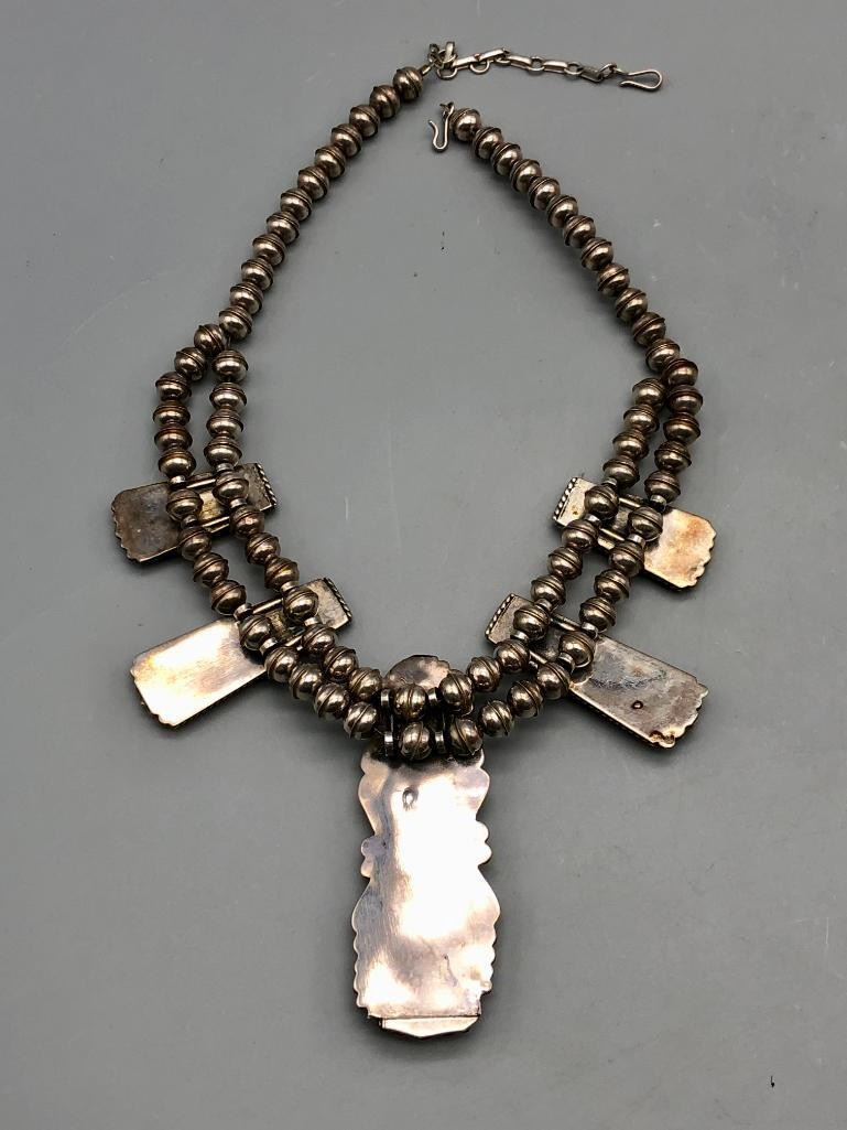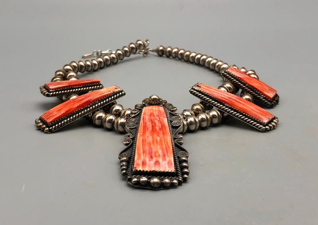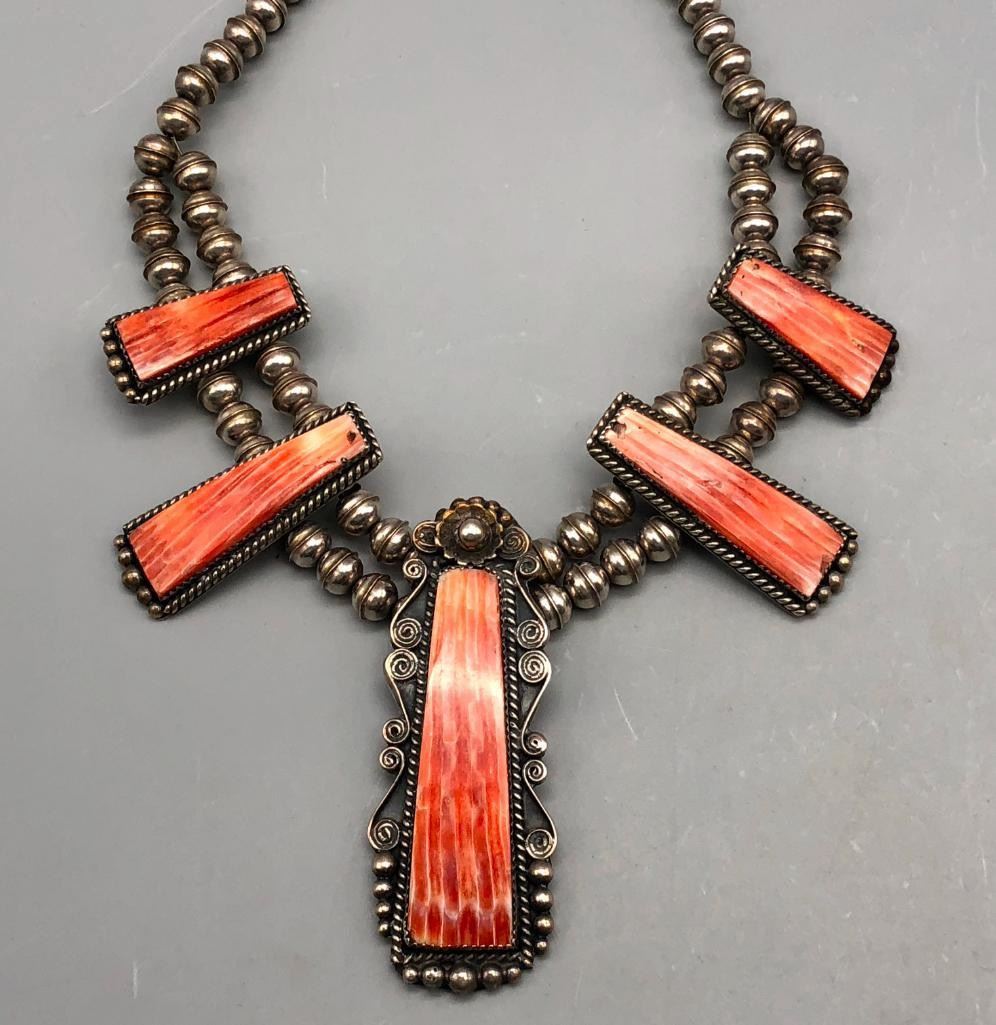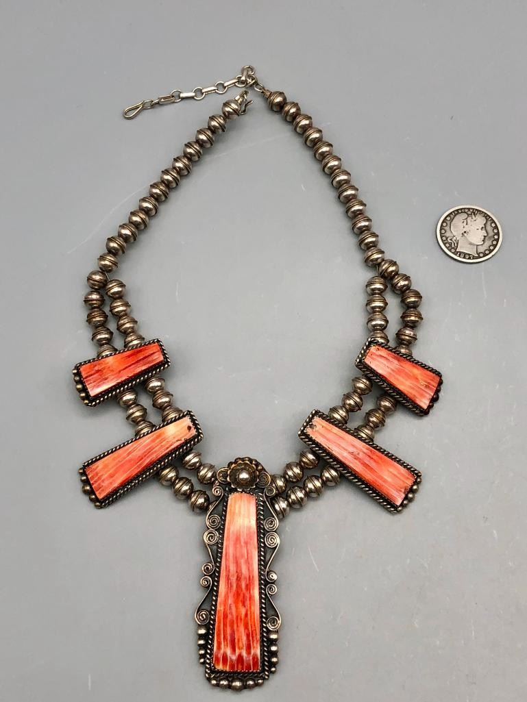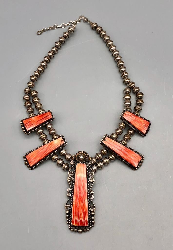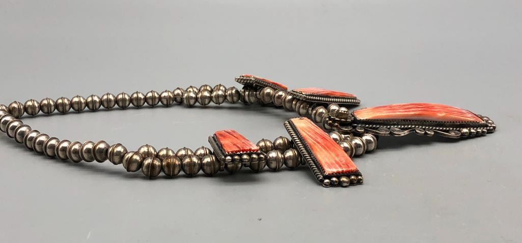 Presented for sale in this lot is a splendid spiny oyster and sterling silver necklace. This is a great, shorter style necklace with five long, rectangular cut spiny oyster settings. They have a gorgeous red color to them, as well as having nice silverwork accents. The sterling silver beads are strung on a cable wire and it is sterling silver. MAKER: Unmarked. APPROX AGE: Circa 1980s. SIZE: Fits a 18 inch neck. Center piece is 3 inches long X 1-1/8 inches wide. Weighs 93 grams. CONDITION: Good for its age, normal wear expected. Please look closely at the pictures as they are an important part of our description and are hereby incorporated into the description, specifically with regards to condition. SHIPPING: There will be a $5 handling / packaging fee for shipping this lot. The actual cost of postage will be added on top of that. BUY IT NOW: If you would like to buy this item now, without waiting for the auction day to bid on it, we do offer this option (which is available up to 48 hours before the actual auction starts). The “Buy it Now” price is the high estimate of this lot (plus applicable fees and the Buyer's premium is discounted to 10% when using the Buy it Now option). If you would like to exercise this option, you must contact us by email (or phone as long as you talk to someone live). Reference this lot number and your intention to "Buy it Now."