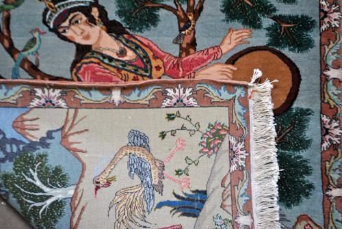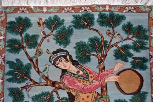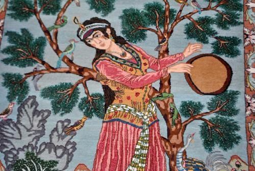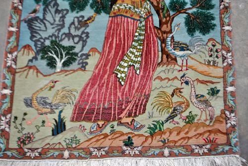Splendid and enchanting fine Persian Tabriz pictorial. Size 2.10 x 3.8 feet, made of fine quality baby lamb's wool pile on cotton foundation, all natural vegetable dye, this enchanting rug depicts a young and beautiful Persian woman, dressed in traditional Persian clothing and performing an enchanting dance amongst the wildlife in the woods. Hand woven in Tabriz, Iran, a truly lovely and enchanting rug.