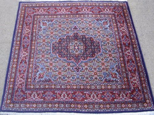 Absolutely splendid and intricate baby lamb's wool pile persian moud mashad rug. 100%natural, vegetable dye, hand woven, rarest baby lamb's wool pile on cotton foundation. this finely woven moud mashad with its fish design on a blue background, embodies the tangible form of a simple and complex at the same time, intricately, yet marvelously executed art form underfoot. this lovely piece is masterfully hand woven, knot by knot, using superior quality baby lamb's wool and it has about 180 knots per square inch. it takes over two years to weave and create this beauty. the lustrous and glowing silk highlights give this lovely piece an added three dimensional character. moud is a satellite town in the proximity of mashad, the capital of khorasan province within iran. however the word moud epitomizes the finest and most fabulous rugs of the khorasan province rug producing centers. please notice that also attesting to the fine weave is the fact that the back of this rug looks as good as the front. 4 feet 1 inch X 4 feet. Country of Origin: Iran.