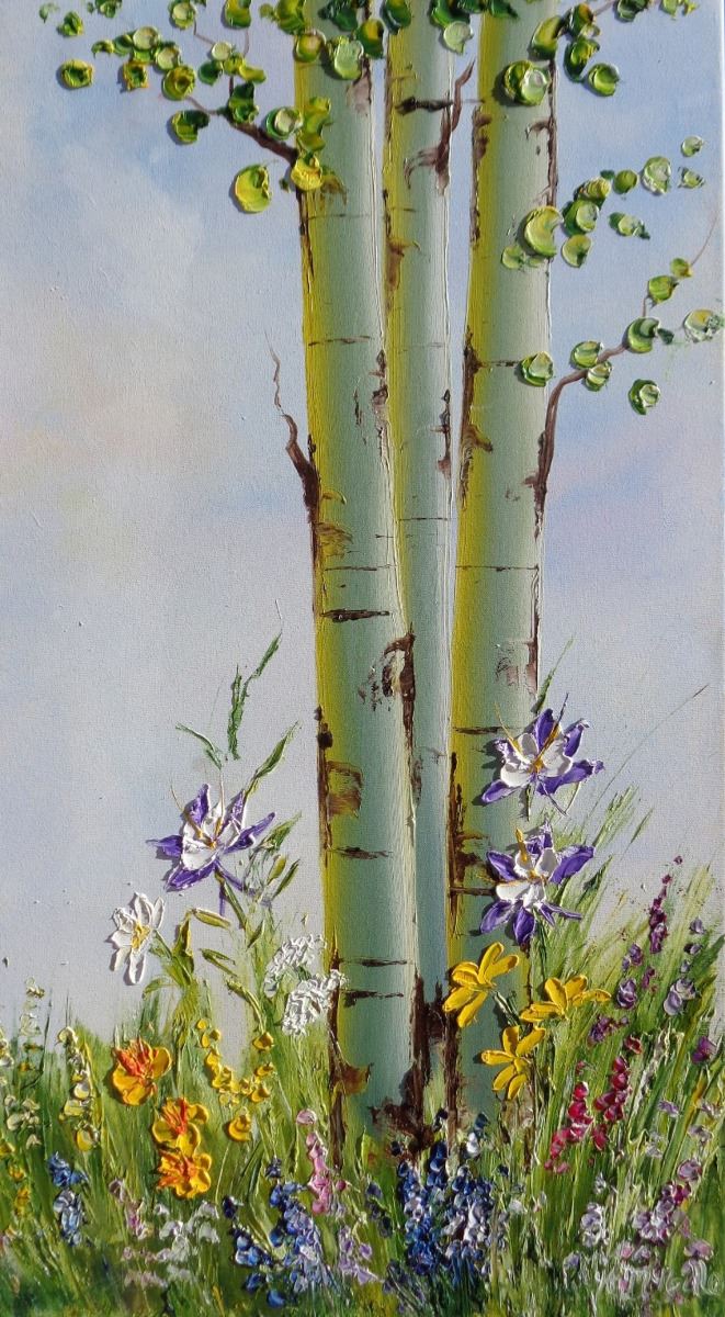 Artist: Katherine McNeill. Title: Splendor. Medium: Oil on canvas. Size: 36" x 12" x 2". Framed size (if applicable): Museum Wrapped Artist's description: Known for my Aspen Paintings, I painted this group of aspens surrounded by Colorado wildflowers. Using self designed pallet knives makes one feel they can pick the flowers off the canvas. Shipping from ZIP CODE 80118.