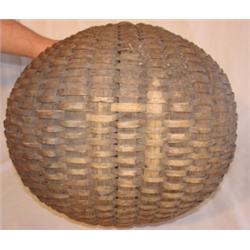 Splint oak field basket with handle. Measures 7" to top of basket and 13" to top of handle. Has a dia. of 14 1/2" x 12" and is constructed with early rose head nails.