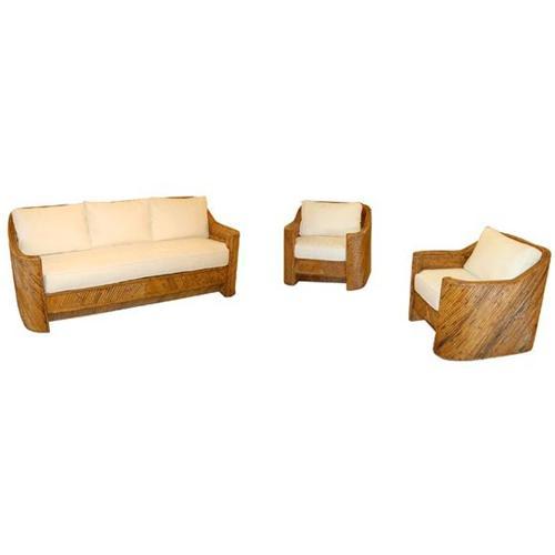 Sette and pair of lounge chairs in split rattan. Large and comfortable form.