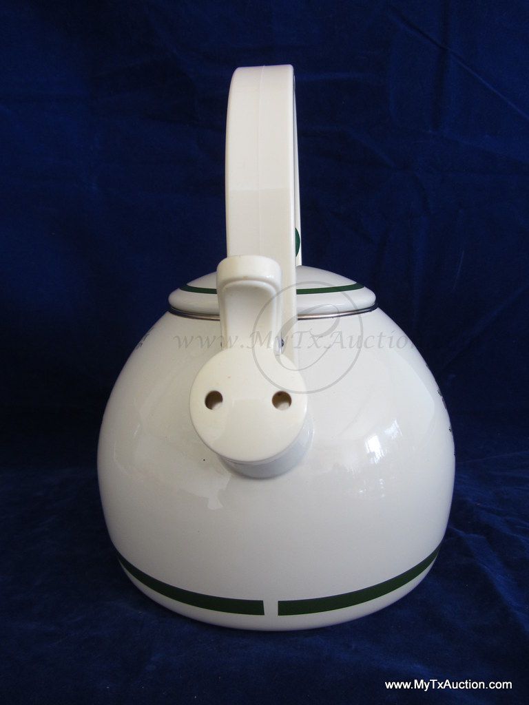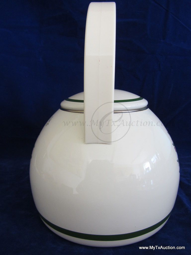bounty of presents with green trim. NOTE: there is a black mark next to spout and the bottom center of tea kettle the enamel is cracking (see images for details)
