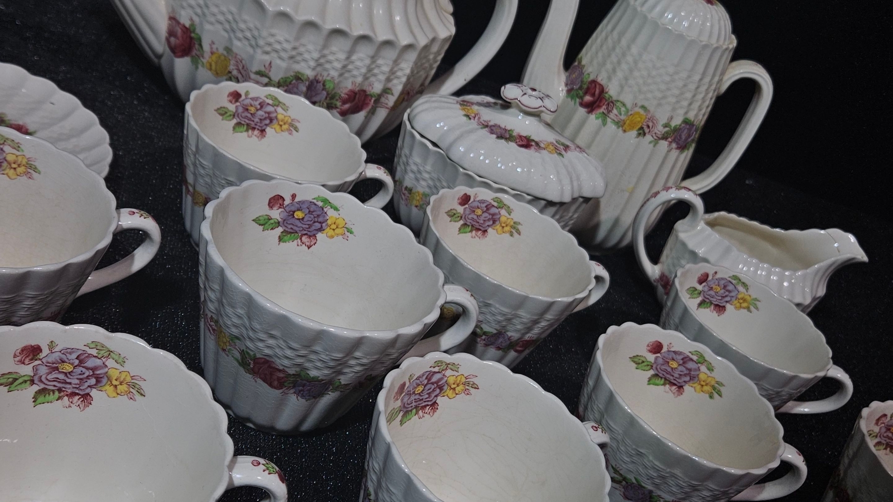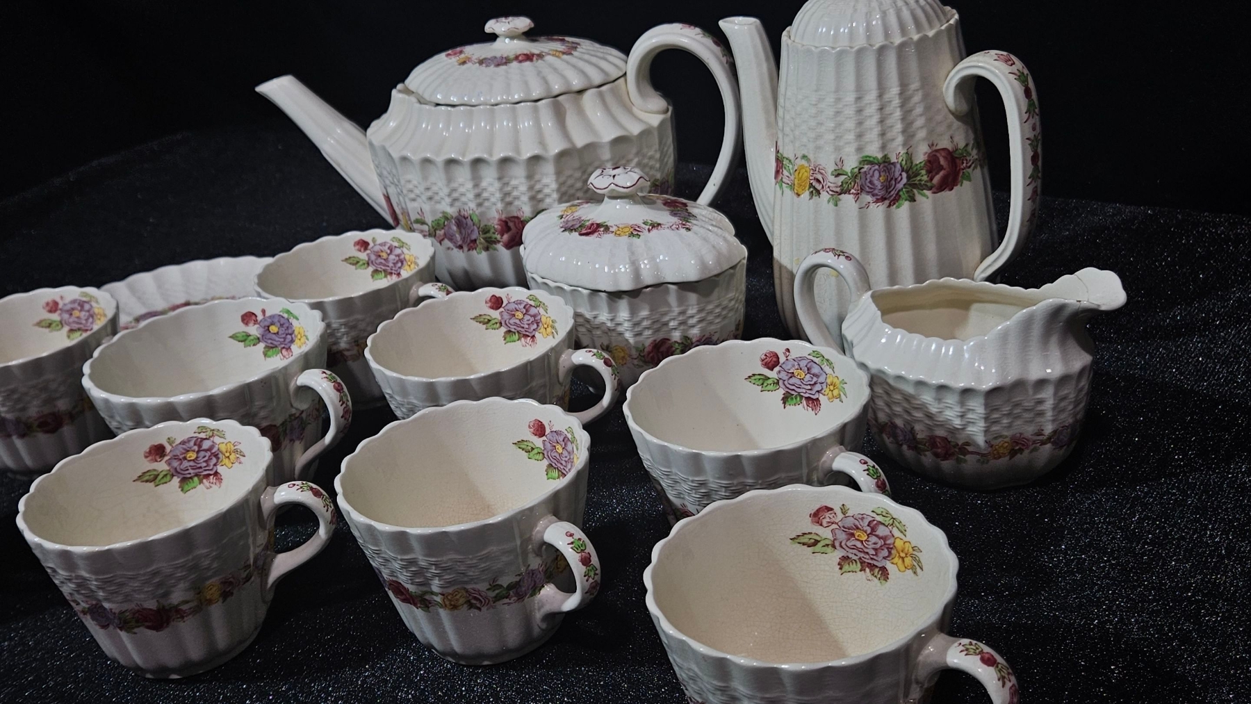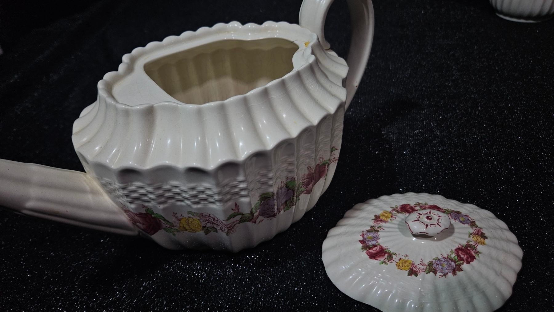 The set showcases traditional English porcelain craftsmanship originally produced by Copeland Spode, known for fine bone china and classic floral patterns. The textured design and soft floral motif give the set a timeless vintage tea service style ideal for display or entertaining.