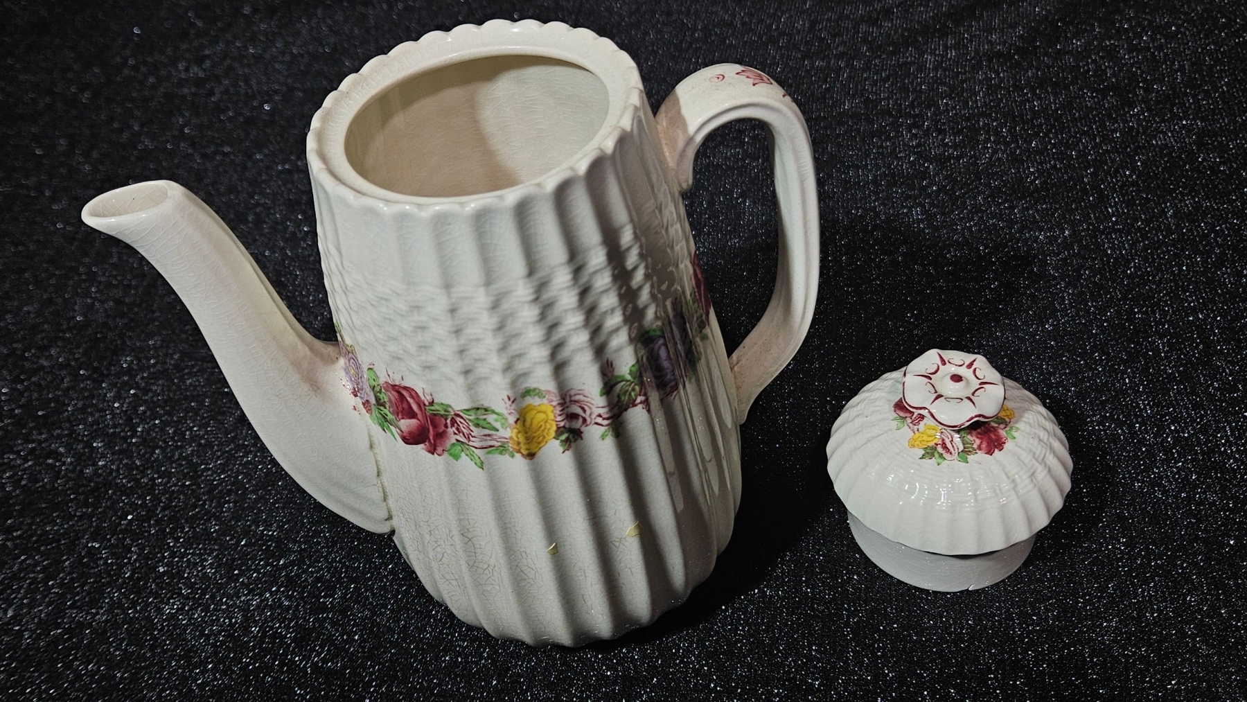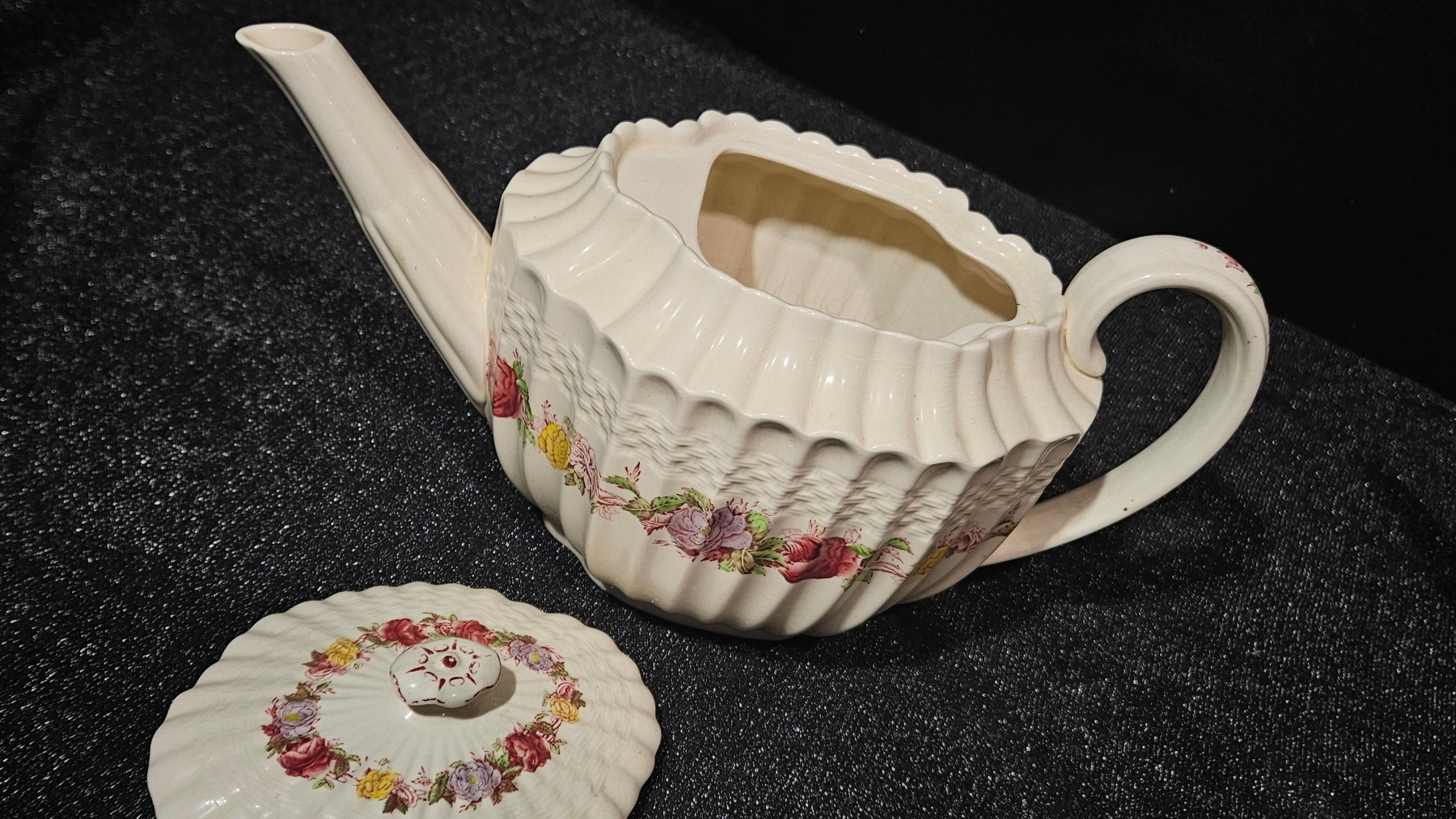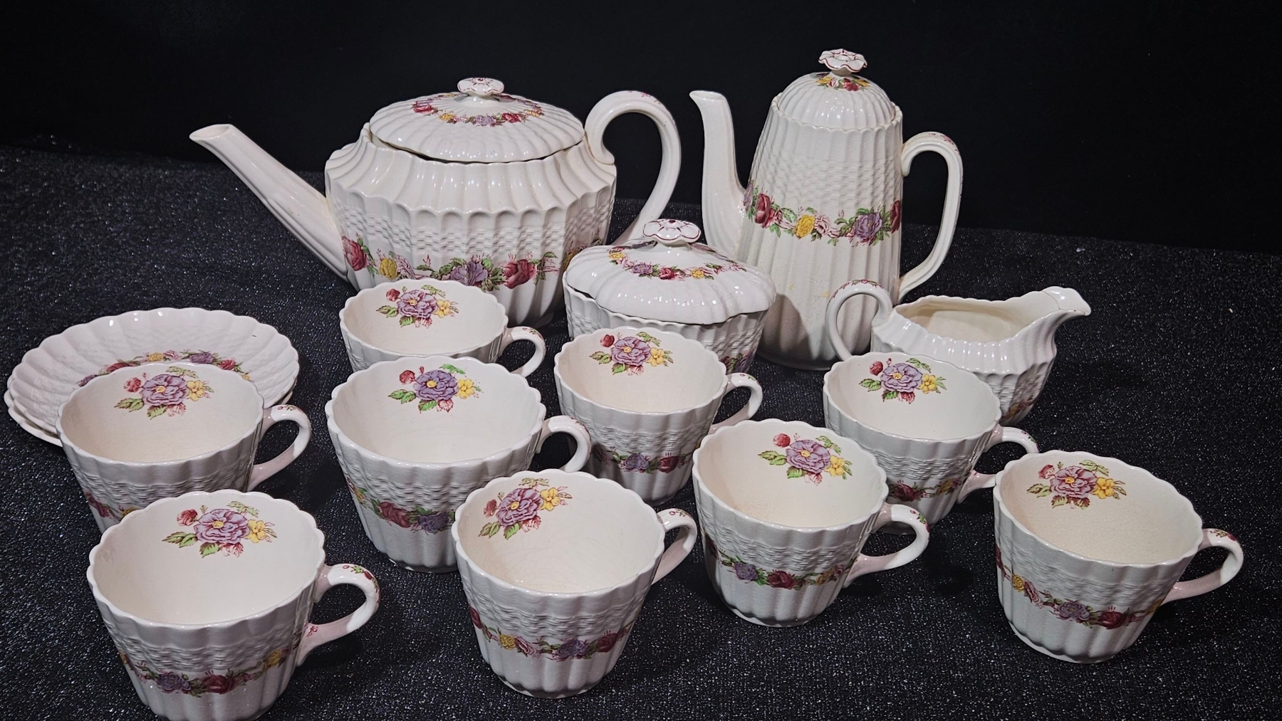 The set showcases traditional English porcelain craftsmanship originally produced by Copeland Spode, known for fine bone china and classic floral patterns. The textured design and soft floral motif give the set a timeless vintage tea service style ideal for display or entertaining.