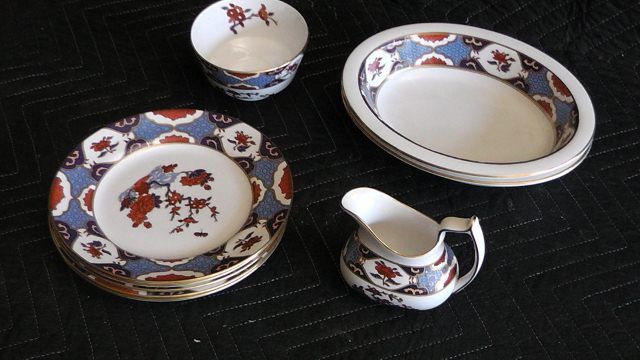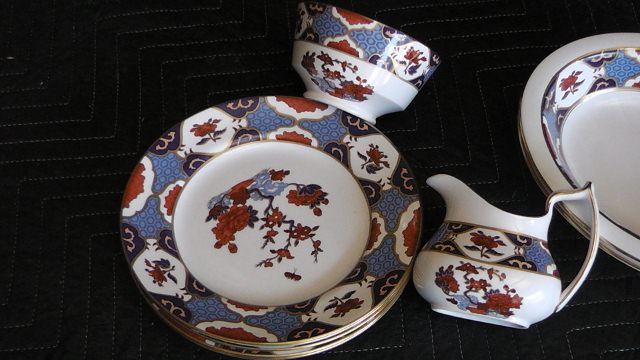 Shima Border, 2 bowls, 1 soup, 1 creamer, 5 salad plates