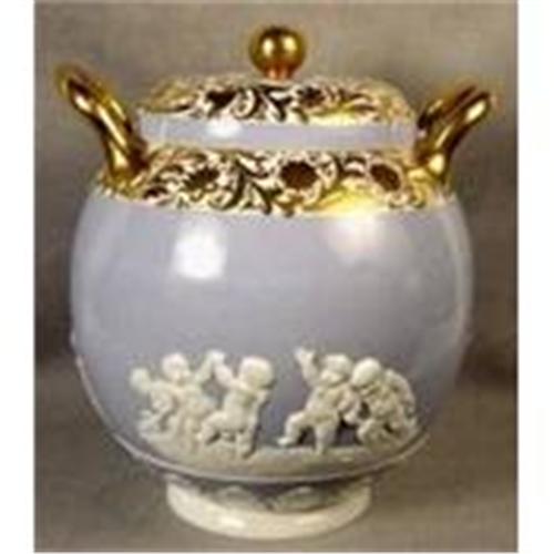 Spode Large Twin Gilt Handled Pot Pouri White Embossed Cherubs at Play on Pale Lilac Ground c1820