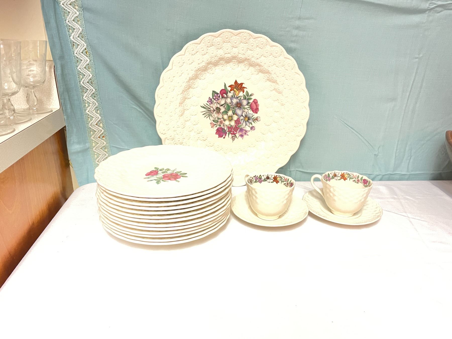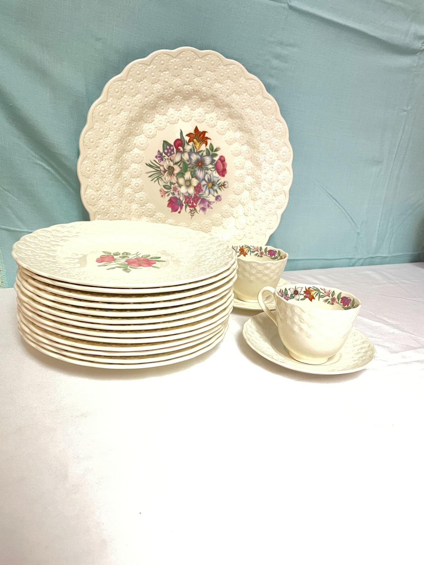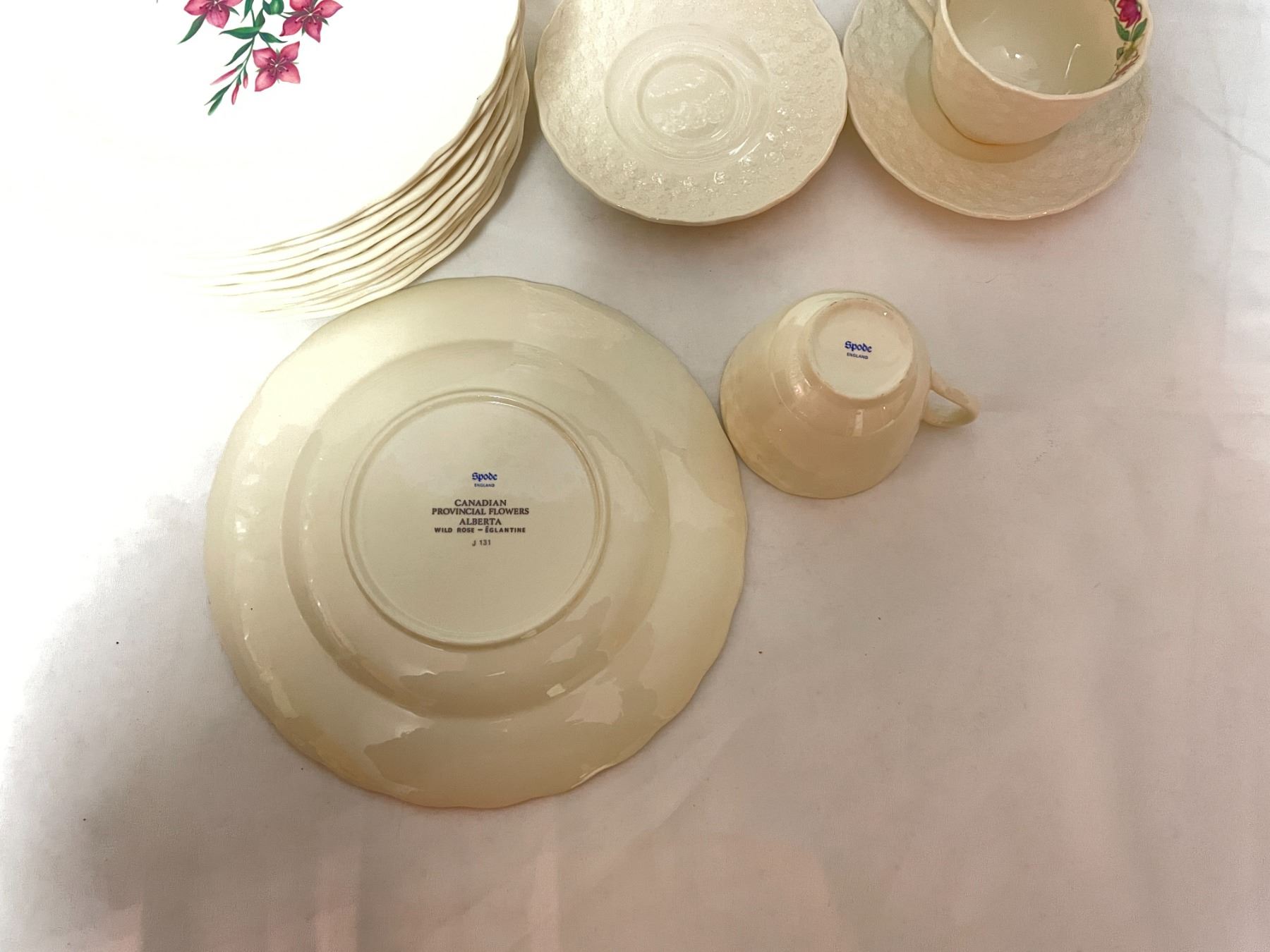 Includes Platter 13" diameter - 2 cups and saucers. 9" diameters includes 2 Alberta plates, 1 Yukon - 1 Quebec - 1 Manitoba - 1 Saskatchewan - 1 Newfoundland - 1 British Columbia - 1 Ontario - 1 Nova Scotia - 1 New Brunswick - 1 Northwest Territories