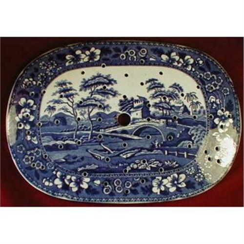 Beautiful antique transferware meat drainer in the very popular Spode's Tower pattern in blue. This pattern features fisherman by the bridge, game birds in the foreground and Palm trees in the background.<p>This plate goes on a meat platter and is used when the roast is carved at the table. It hold the meat above the plate so the juice can drain underneath.