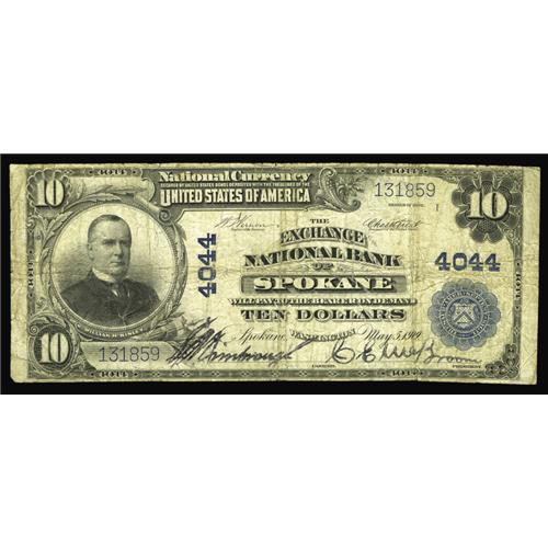 <B>Spokane, WA</B></I> - $10 1902 Plain Back Fr. 626 <B>The Exchange NB</B></I> Ch. # 4044<BR>S.A. Kimbrough and C.E. McBroom were the officers of this bank that failed on January 18, 1929 because of incompetent management. <B>Fine.</B></I>