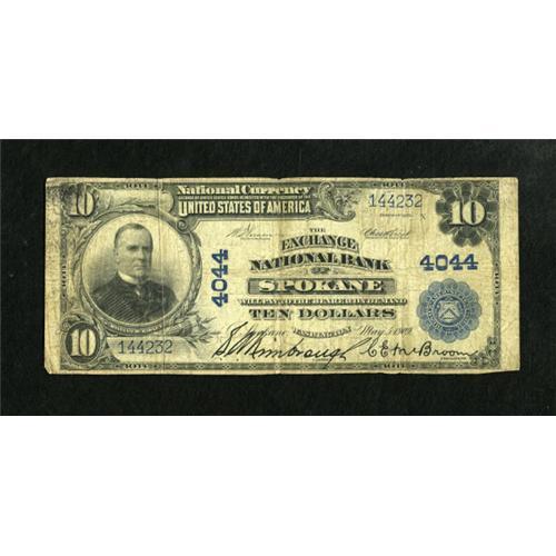 <B>Spokane, WA</B></I> - $10 1902 Plain Back Fr. 626 <B>The Exchange NB</B></I> Ch. # 4044<BR> Some light wallet staining is noted on this boldly autographed issue. <B>Very Good-Fine.</B></I><BR><I>From The Walla Walla Collection</B></I><BR><BR><b>Shipping:</b> Coins & Currency (<a target="_blank" href="http://www.heritageauctions.com/common/shipping.php">view shipping information</a>)