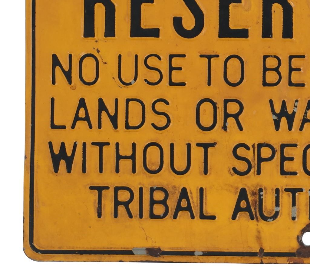 For your consideration is this Spokane Indian Reservation steel sign circa mid to late 1900s. The sign is from the Spokane area on the border of the reservation. It shows a yellow background and reads, "Spokane Indian Reservation / No Use To Be Made of Any Lands or Waters Herein Without Specific Written Tribal Authorization" in black lettering. The sign has two mounting holes, one on the top and one on the bottom. It shows fair condition with wear present from its age and life outdoors but no obvious signs of damage are present. The sign measures 11 1/16" L x 11 15/16" W.