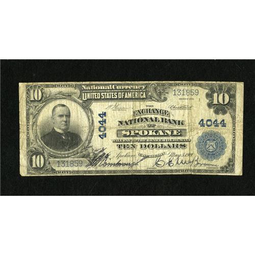<B>Spokane, WA</B></I> - $10 1902 Plain Back Fr. 626 <B>The Exchange NB</B></I> Ch. # 4044<BR>S.A. Kimbrough and C.E. McBroom were the officers of this bank that failed on January 18, 1929 because of incompetent management. <B>Fine.</B></I><BR><BR><b>Shipping:</b> Coin/Currency (<a target="_blank" href="http://www.heritageauctions.com/common/shipping.php">view shipping information</a>)