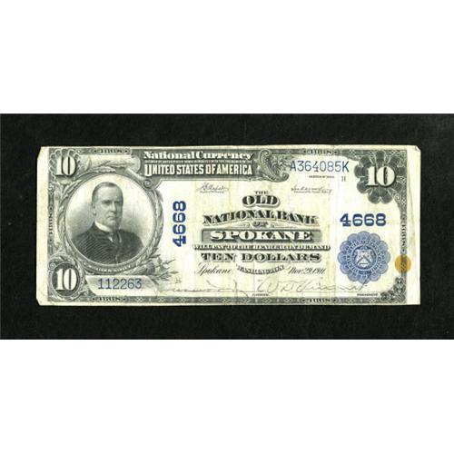 <B>Spokane, WA</B></I> - $10 1902 Plain Back Fr. 628 <B>The Old NB</B></I> Ch. # 4668<BR> A light spot is noted on this stamped signature issue. There is no geographic sort letter on this note. <B>Fine.</B></I><BR><I>From The Walla Walla Collection</B></I><BR><BR><b>Shipping:</b> Coins & Currency (<a target="_blank" href="http://www.heritageauctions.com/common/shipping.php">view shipping information</a>)