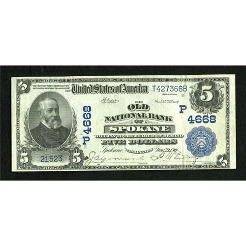 <B>Spokane, WA</B></I> - $5 1902 Plain Back Fr. 602 <B>The Old NB</B></I> Ch. # (P)4668<BR> A pleasing crisp example from a difficult state to find original material from. <B>Very Fine+</B></I>.<BR><I>From The Walla Walla Collection</B></I><BR><BR><b>Shipping:</b> Coins & Currency (<a target="_blank" href="http://www.heritageauctions.com/common/shipping.php">view shipping information</a>)