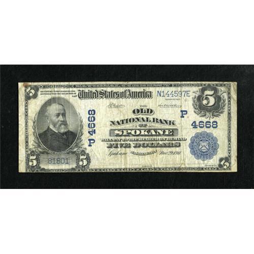 <B>Spokane, WA</B></I> - $5 1902 Plain Back Fr. 602 <B>The Old NB</B></I> Ch. # (P)4668<BR> The paper is clean and solid for the amount of use it saw. <B>Fine.</B></I><BR><BR><b>Shipping:</b> Coins & Currency (<a target="_blank" href="http://www.heritageauctions.com/common/shipping.php">view shipping information</a>)