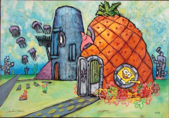 This limited edition Giclée Print on canvas reproduces artists Douglass Truth's imaginative painting of everyone's favorite sea sponge, SpongeBob SquarePants along with his adorable best pal, Patrick Star. Both characters wave to us from SpongeBob's Pineapple house in Bikini Bottom.