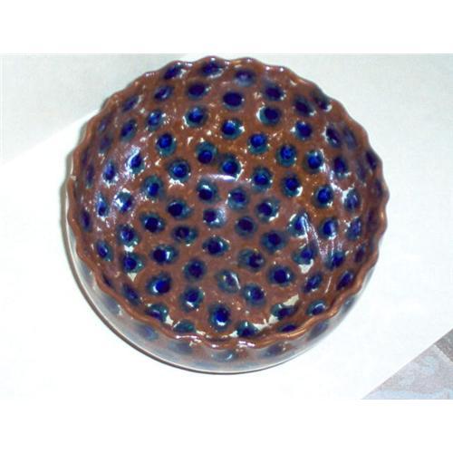 This bowl has a small surface scratch at the crimped rim. This scratch took away the glaze and decoration but did not chip the pottery itself. It is stamped on underside "Germany".