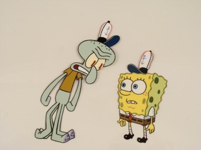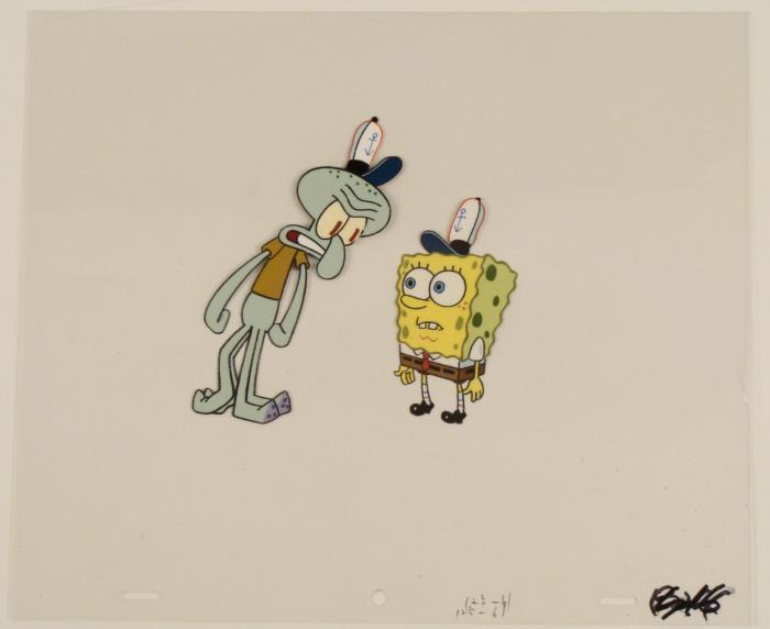 This original animation cel is from the Nickelodeon TV show SpongeBob Squarepants. The story takes place under the deep blue sea in Bikini Bottom, where SpongeBob resides. SpongeBob, who is a yellow, porous sponge, is your typical happy-go-lucky character, as he is always cheerful and enjoys making people laugh. Patrick Star, SpongeBob's neighbor who is a starfish, is your average children's show idiot, as he boasts knowing nothing and is often getting himself into ridiculous situations. Between the homes of these two lies the home of the miserable Squidward, a squid, who is known for being grouchy and playing tricks on SpongeBob and Patrick. Both SpongeBob and Squidward work at the Krusty Krab, a fast food business run by the greedy money-loving Mr. Krabs, a crab, the arch rival of the evil, possibly misunderstood, Plankton. Another neighbor, Sandy Cheeks, an athletic squirrel who normally wears an astronaut's space suit, was introduced in "Tea at the Treedome." She spends most of her time inventing and experimenting. Why is Squidward very angry at SpongeBob.Original Production Animated Cel Overall Size of Cel: 10 1/2" x 12 1/2" Very Good ConditionThis is an original hand-painted cel set-up used in the production of an episode of "SpongeBob SquarePants." Each one-of-a-kind set-up represents a slight change in position of the characters. When individually photographed and projected in rapid succession, the images appear to move.