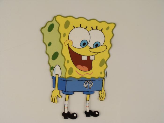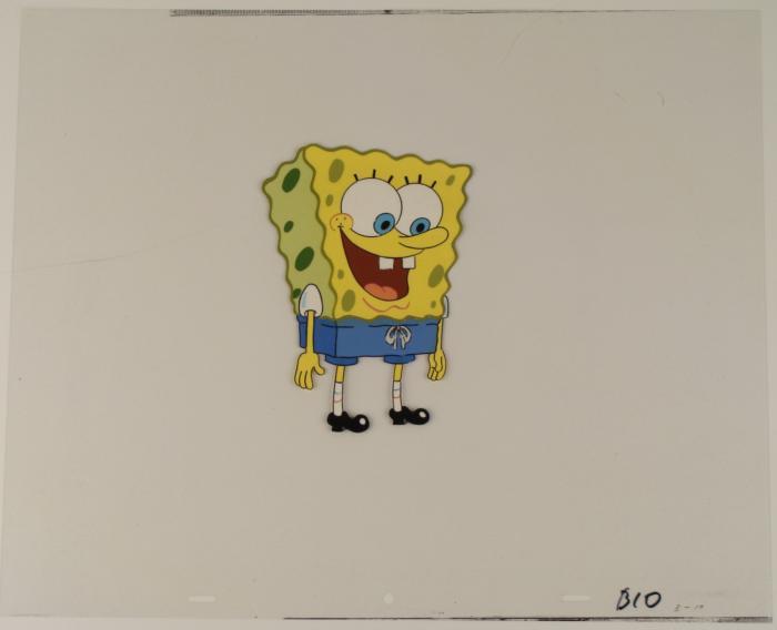 This original animation cel is from the Nickelodeon TV show SpongeBob Squarepants. The story takes place under the deep blue sea in Bikini Bottom, where SpongeBob resides. SpongeBob, who is a yellow, porous sponge, is your typical happy-go-lucky character, as he is always cheerful and enjoys making people laugh. Patrick Star, SpongeBob's Starfish neighbor, boasts knowing nothing and is often getting himself into ridiculous situations. Between the homes of these two lies the home of the miserable Squidward, a squid, who is known for being grouchy and playing tricks on SpongeBob and Patrick. Both SpongeBob and Squidward work at the Krusty Krab, a fast food business run by the greedy money-loving Mr. Krabs, a crab, the arch rival of the evil, possibly misunderstood, Plankton. Another neighbor, Sandy Cheeks, an athletic squirrel who normally wears an astronaut's space suit, was introduced in "Tea at the Treedome." She spends most of her time inventing and experimenting. This cel is larger than average. In it, SpongeBob looks extremely happy. Original Production Animated Cel Overall Size of Cel: 13 1/2" x 16 1/2" Excellent Condition; slight outline wearEach one-of-a-kind set-up represents a slight change in position of the characters. When individually photographed and projected in rapid succession, the images appear to move.