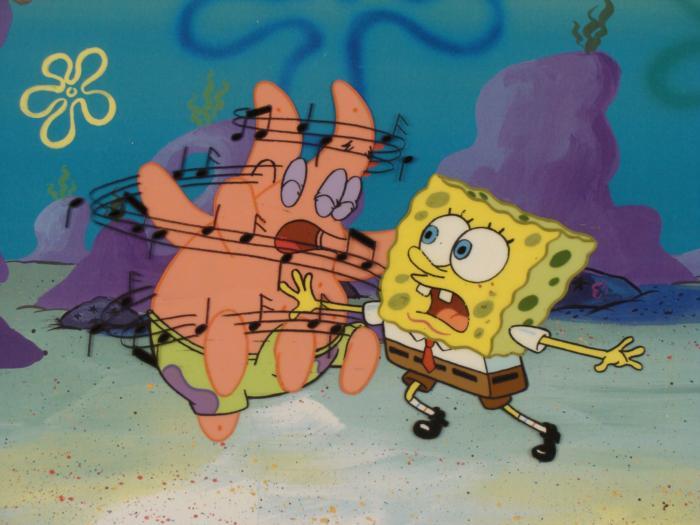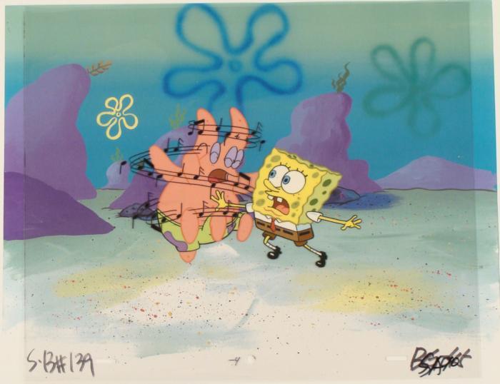 This animation cel and reproduction background are from the Nickelodeon TV show SpongeBob Squarepants. The story takes place under the deep blue sea in Bikini Bottom, where SpongeBob resides. SpongeBob, who is a yellow, porous sponge, is your typical happy-go-lucky character, as he is always cheerful and enjoys making people laugh. Patrick Star, SpongeBob's neighbor who is a starfish, is your average children's show idiot, as he boasts knowing nothing and is often getting himself into ridiculous situations. Between the homes of these two lies the home of the miserable Squidward, a squid, who is known for being grouchy and playing tricks on SpongeBob and Patrick. Both SpongeBob and Squidward work at the Krusty Krab, a fast food business run by the greedy money-loving Mr. Krabs, a crab, the arch rival of the evil, possibly misunderstood, Plankton. Another neighbor, Sandy Cheeks, an athletic squirrel who normally wears an astronaut's space suit, was introduced in "Tea at the Treedome." She spends most of her time inventing and experimenting. Why are the music notes attacking Patrick?Original Printed Background and Animated Cel Overall Size of Background: 11" x 17" Overall Size of the Cel: 10 1/2" x 12 1/2" Very good condition This is an original hand-painted cel set-up used in the production of an episode of "SpongeBob SquarePants." Each one-of-a-kind set-up represents a slight change in position of the characters. When individually photographed and projected in rapid succession, the images appear to move.